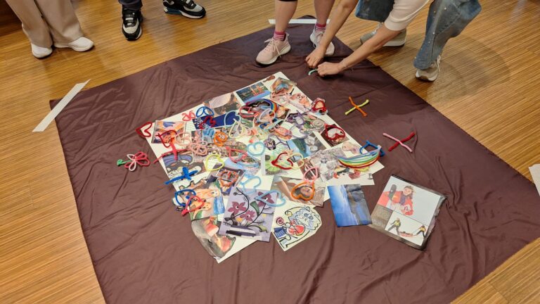 We worked with a group of primary three and four students with learning needs, experiencing an expressive arts workshop. During the warm-up, they were very excited, using their bodies, chairs, and silk scarves to strike unique poses, and then imagined how to portray their own animals. Ultimately, each student created a comfortable environment for their animal, constructing their safe space around a central “Tower of the Forest.”